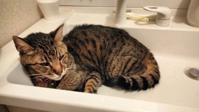 洗面台ねこ、きっと冷たくて気持ちいいに違いない!